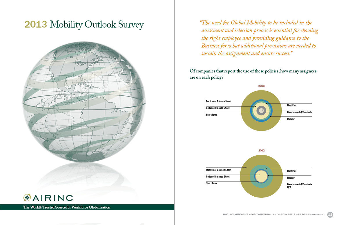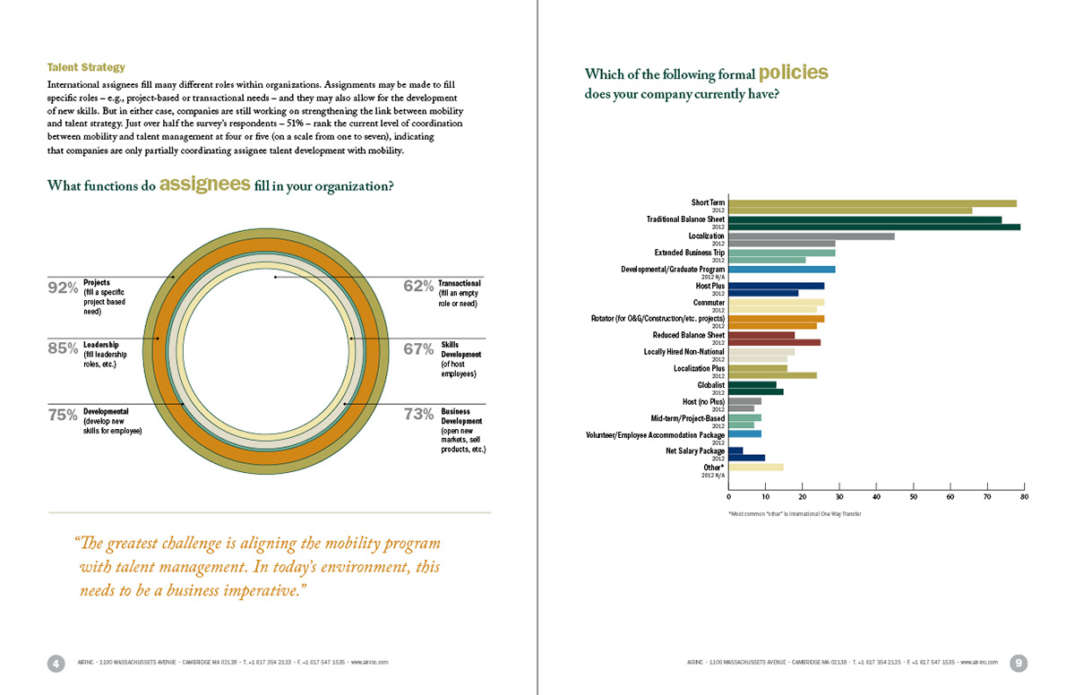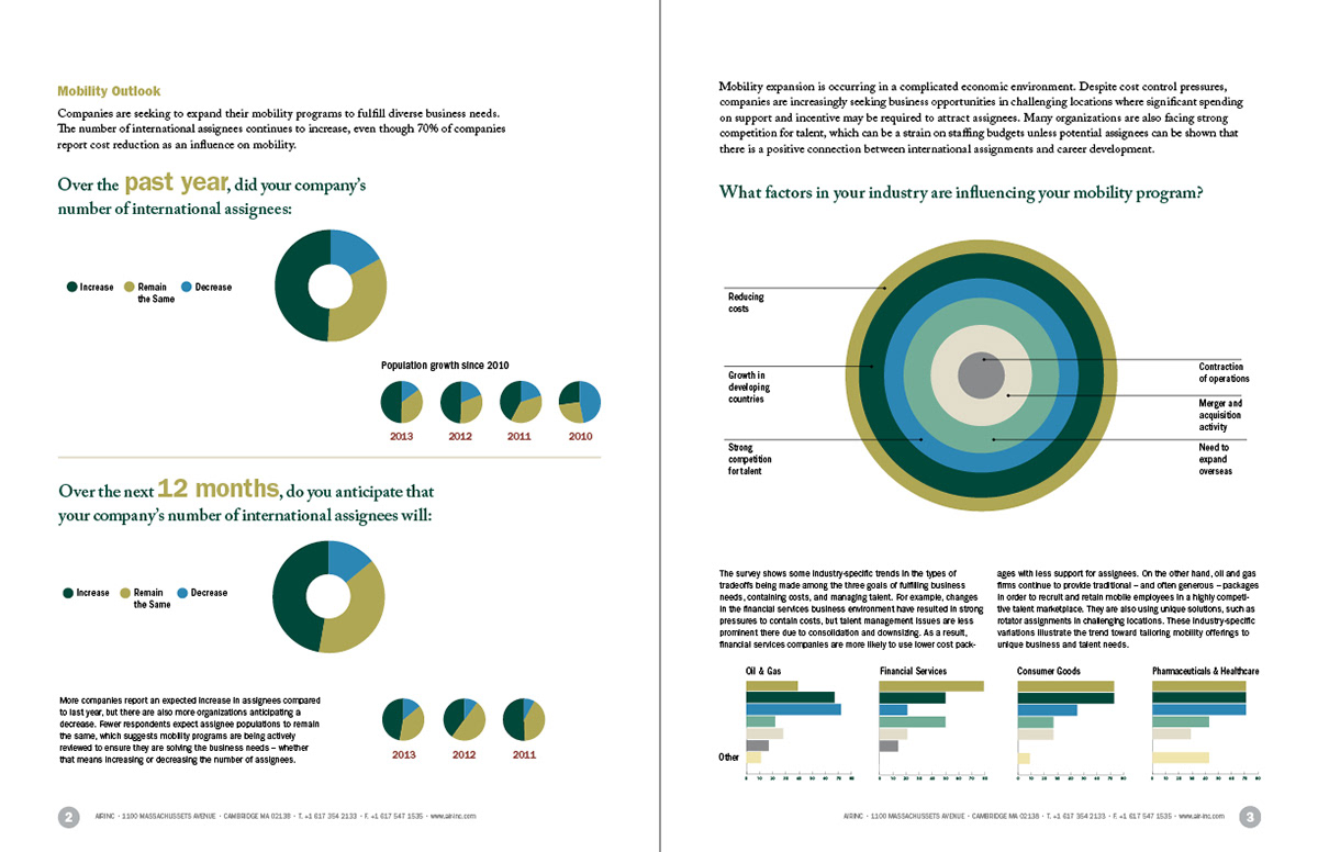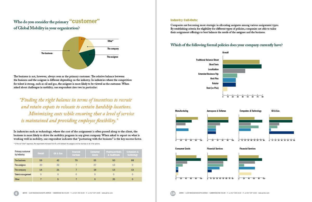 Sample pages from Air Inc. survey report. Designed charts from raw data, established color palette.